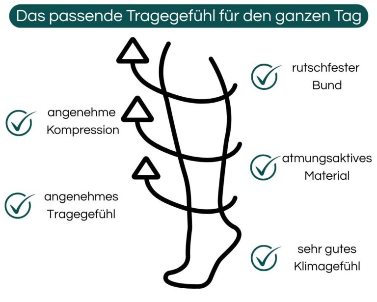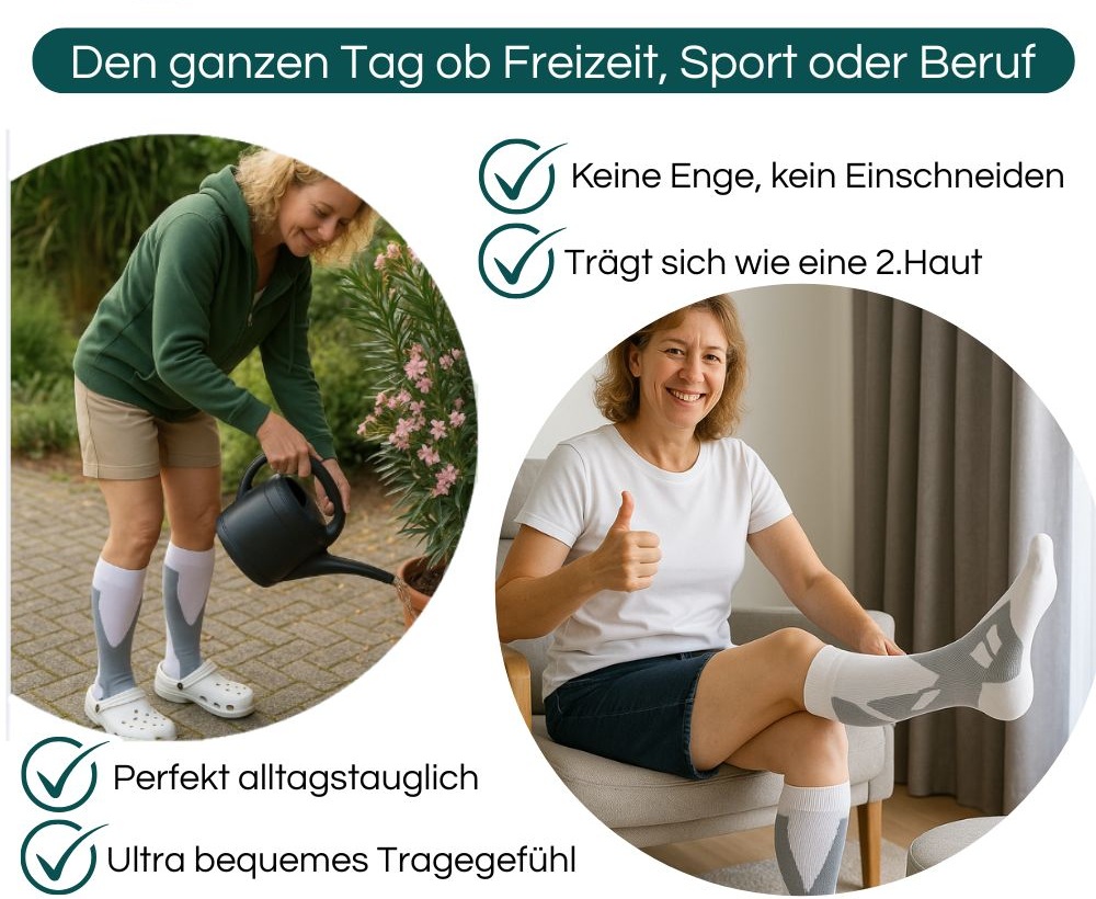 Dank der durchdachten Passform und der angenehmen Kompression liegt der Strumpf sehr gut an und bietet ein bequem unterstützendes Tragegefühl – ohne einzuengen, ohne aufzutragen und ohne einzuschneiden. Genau richtig für Menschen, die täglich viel leisten und dabei flexibel bleiben möchten.