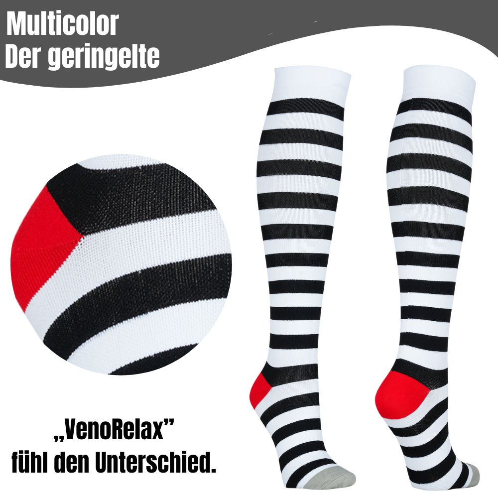 Unsere peppigen und geringelten Kompressions-Stützstrümpfe werden einfach von allen geliebt. Sie bringen Farbe in deinen Alltag – selbstbewusst, modern und voller Persönlichkeit.