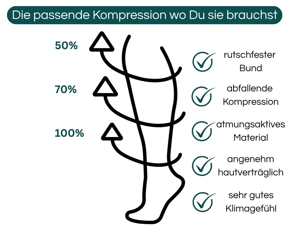 „Kompressions-Stützstrümpfe werden häufig in Alltagssituationen gewählt, in denen die Beine viel leisten müssen. Sie bieten ein angenehm festes Tragegefühl und liegen durch die abgestufte Kompression besonders gut an.“